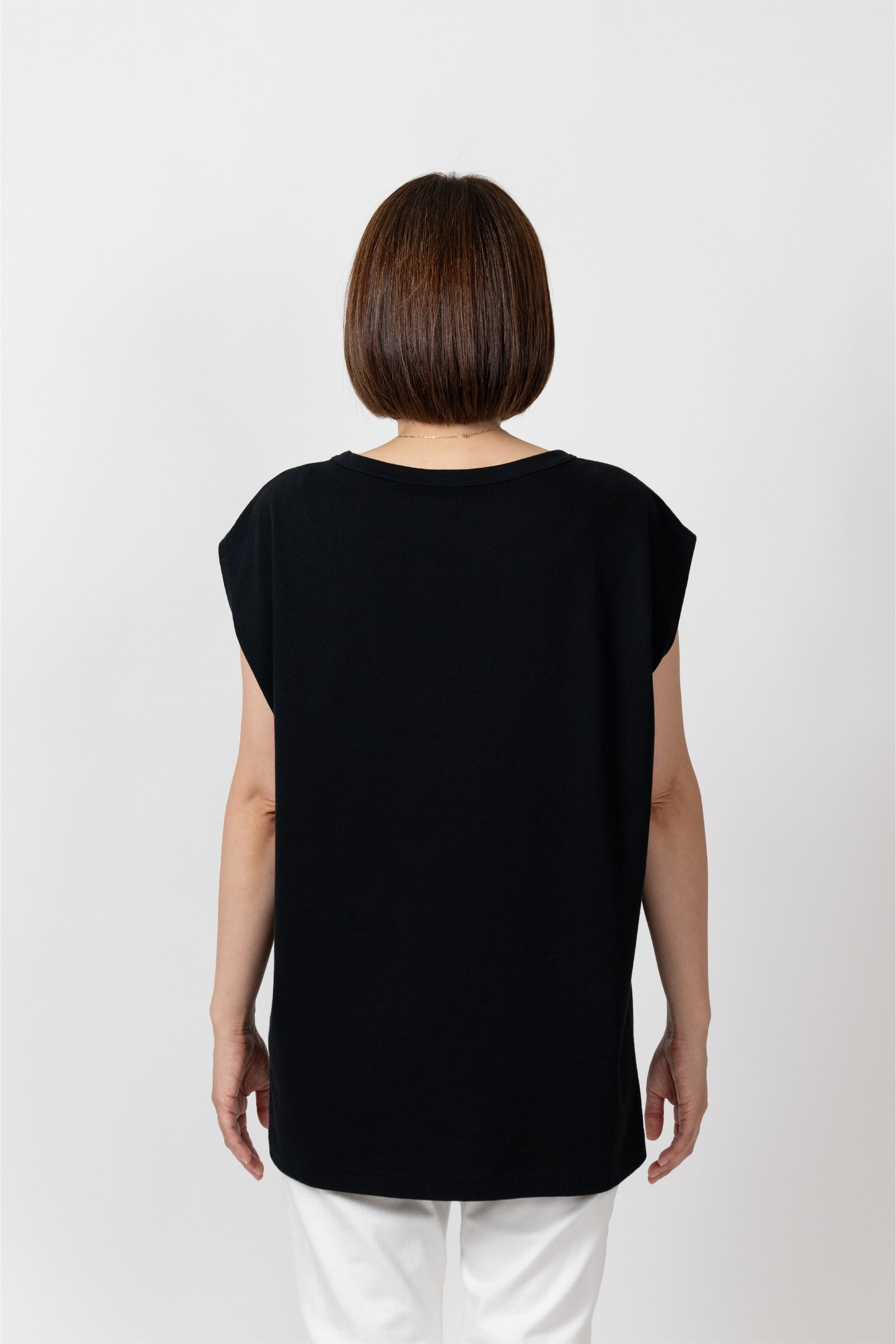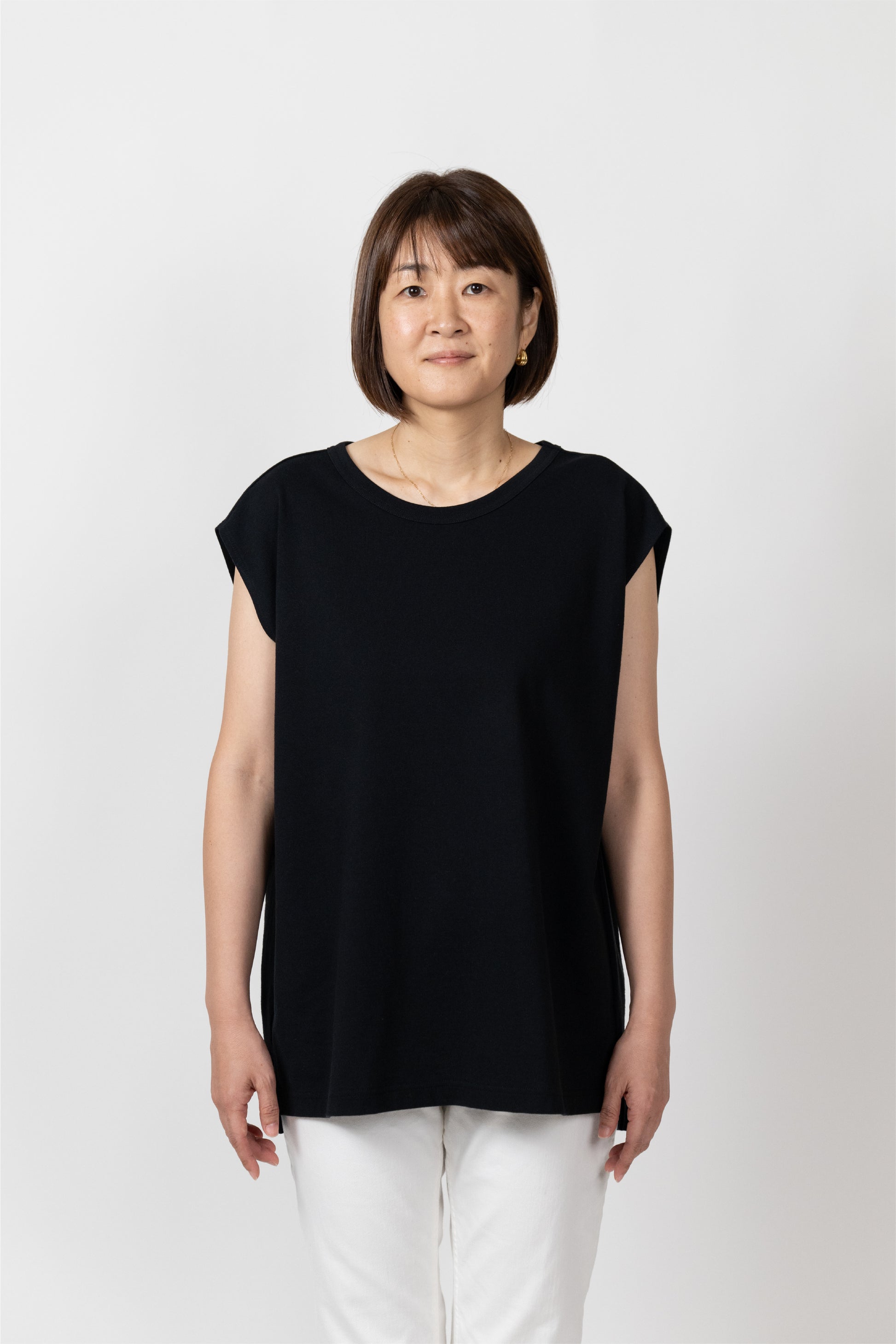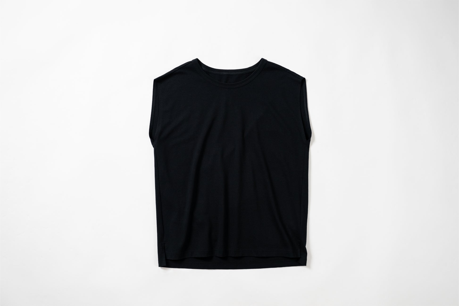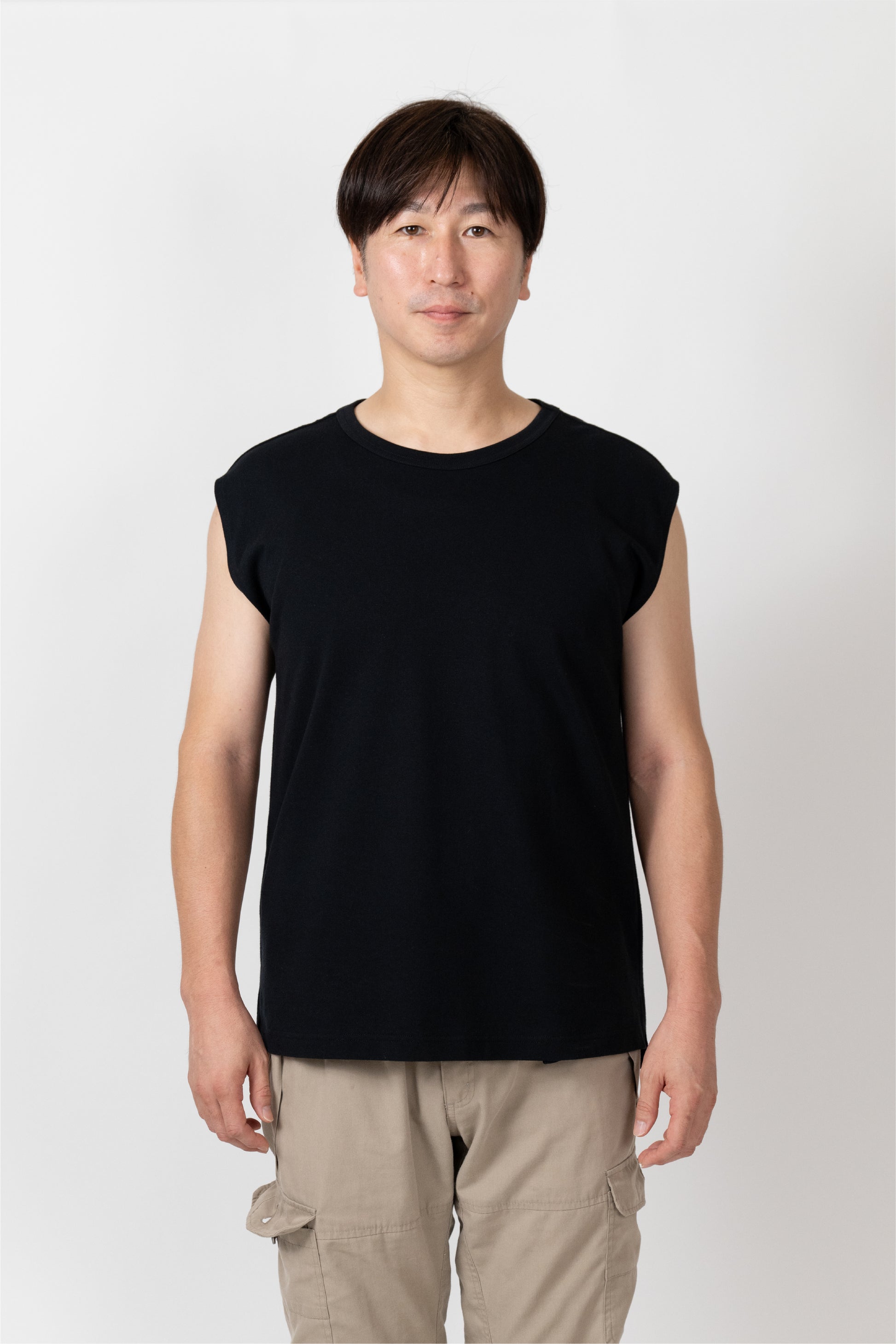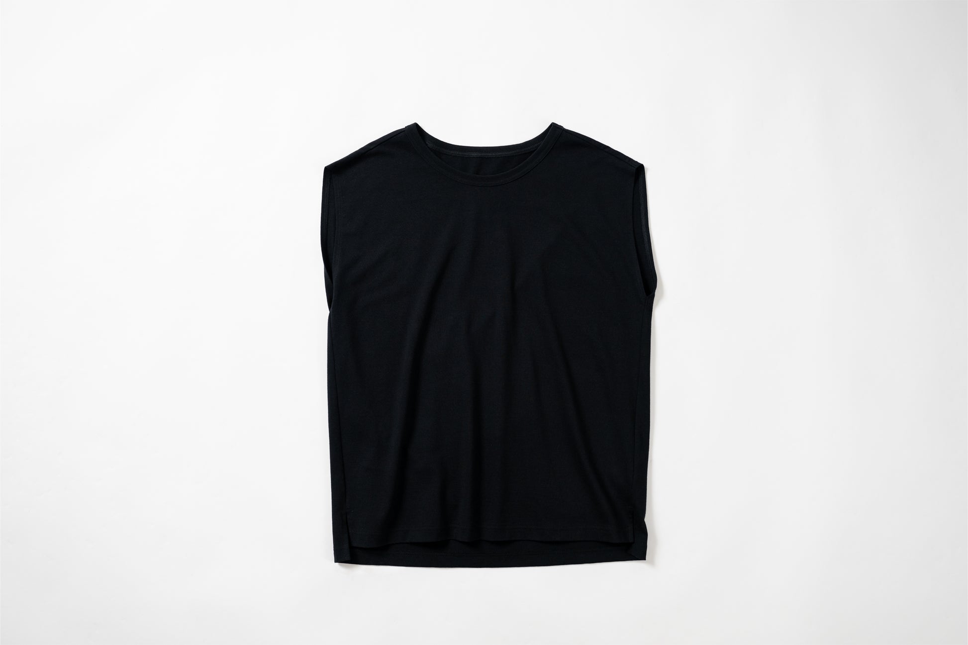 Sleeveless T-shirt with a relaxed fit. The silhouette is designed to fit a rounded shoulder posture having a lot of room around the shoulders, making it easy to move your shoulders without stress regardless of your body shape. The french sleeves cover the shoulders nicely and the neckline is not tight, so it feels comfortable in the summer. A highly versatile piece that can also be worn as an inner layer for shirts and jackets.
