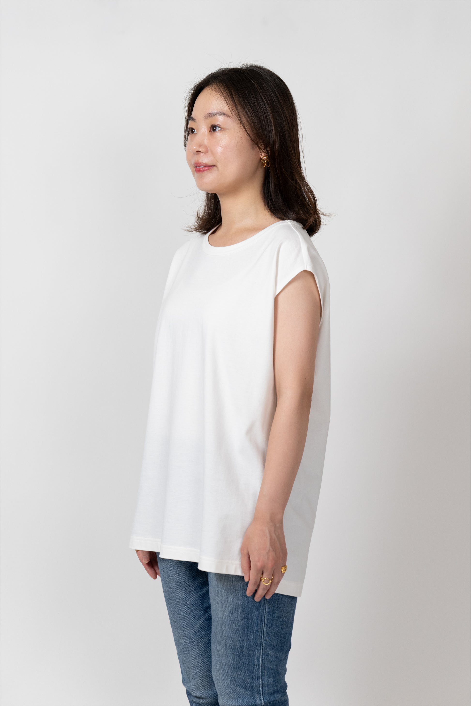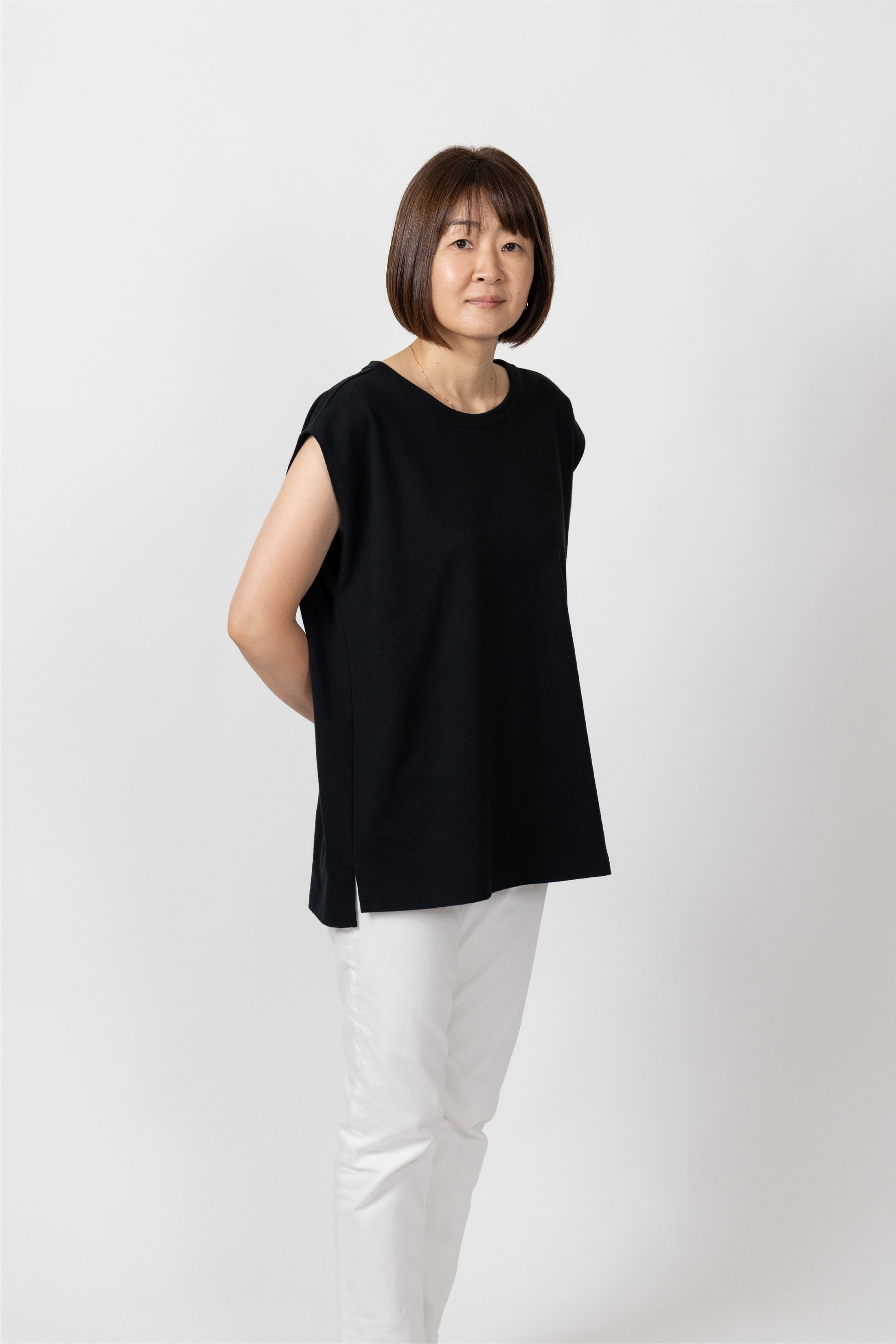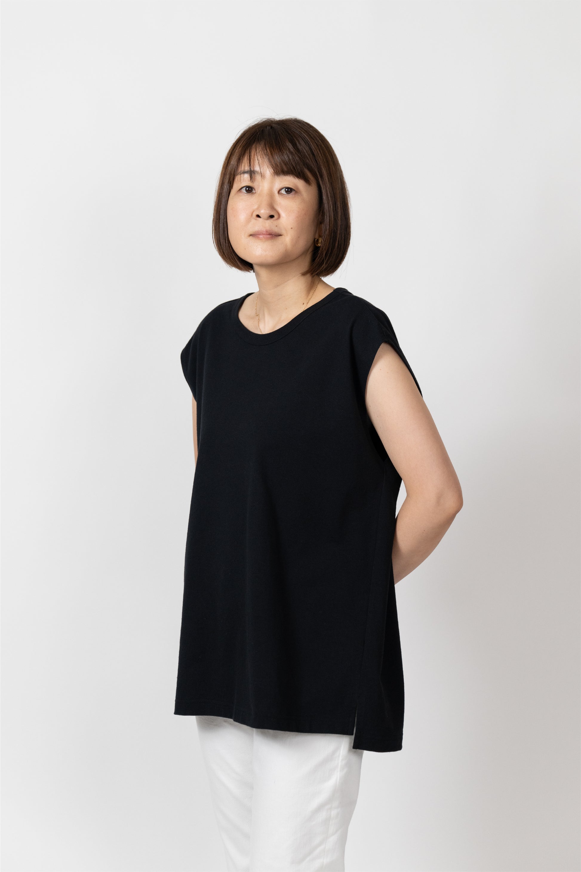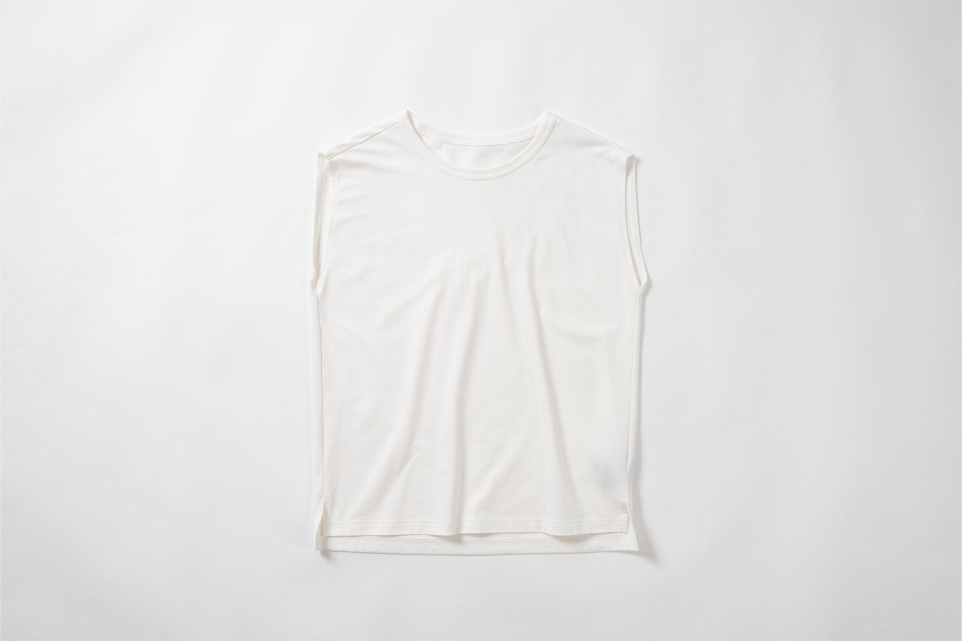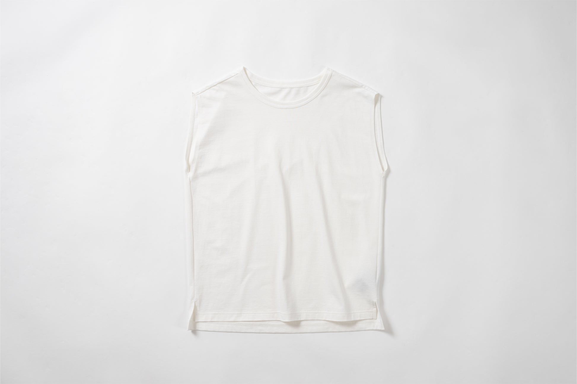 Sleeveless T-shirt with a relaxed fit. The silhouette is designed to fit a rounded shoulder posture having a lot of room around the shoulders, making it easy to move your shoulders without stress regardless of your body shape. The french sleeves cover the shoulders nicely and the neckline is not tight, so it feels comfortable in the summer. A highly versatile piece that can also be worn as an inner layer for shirts and jackets.