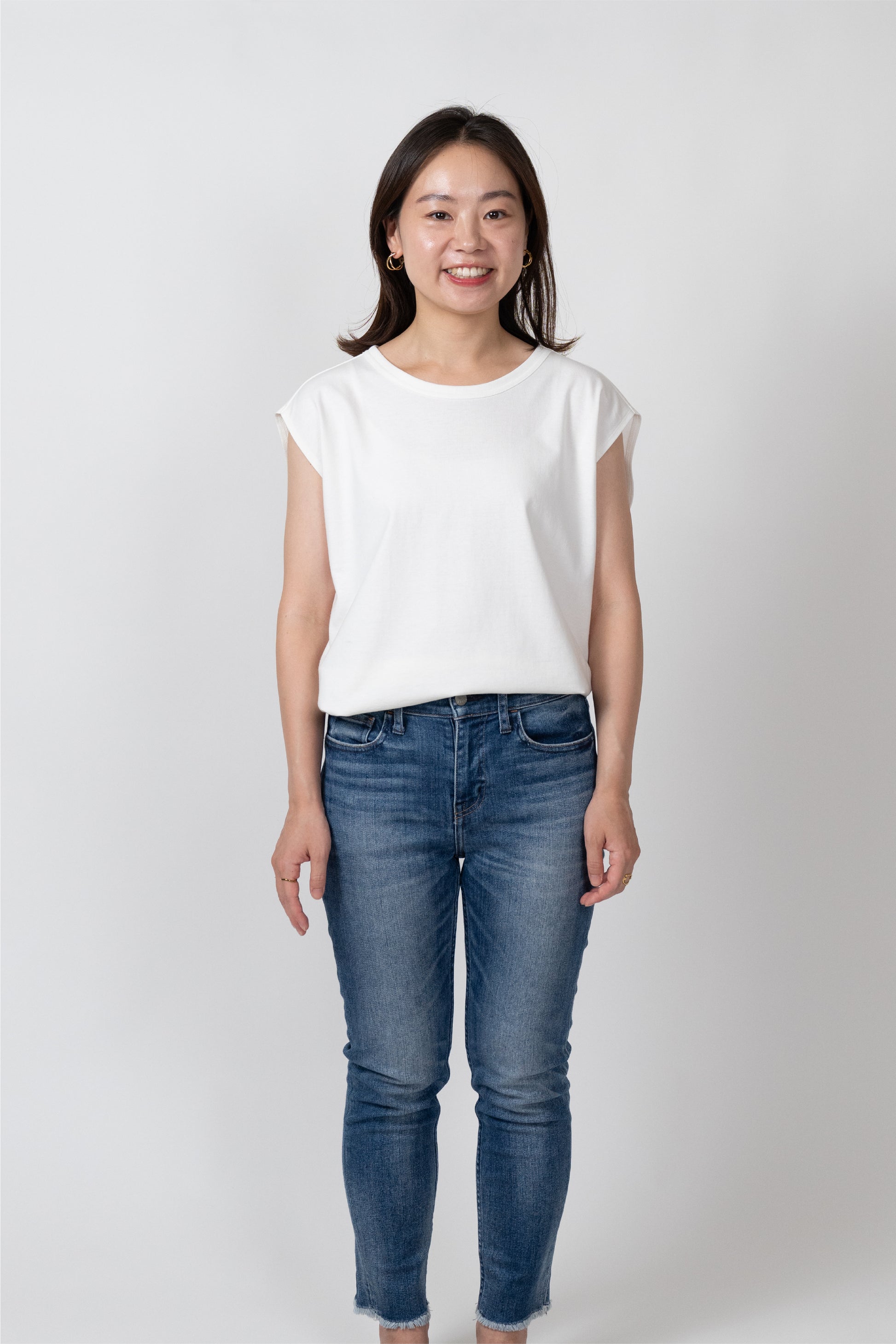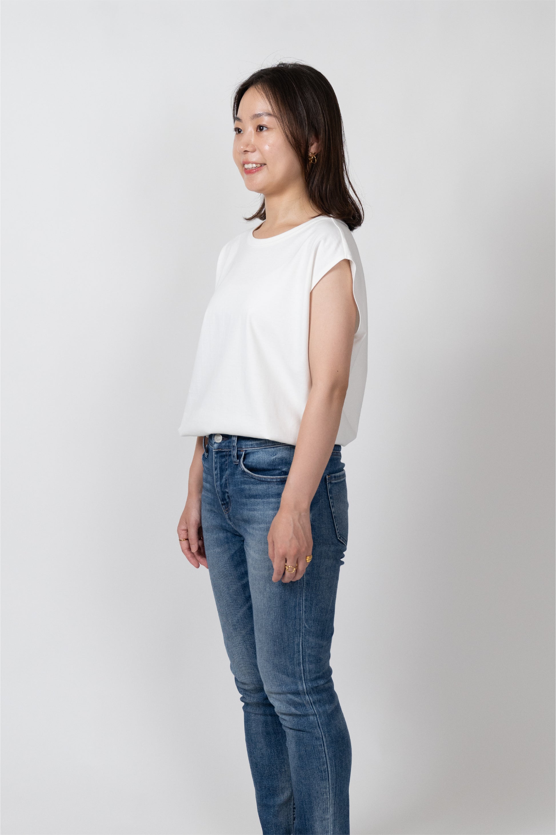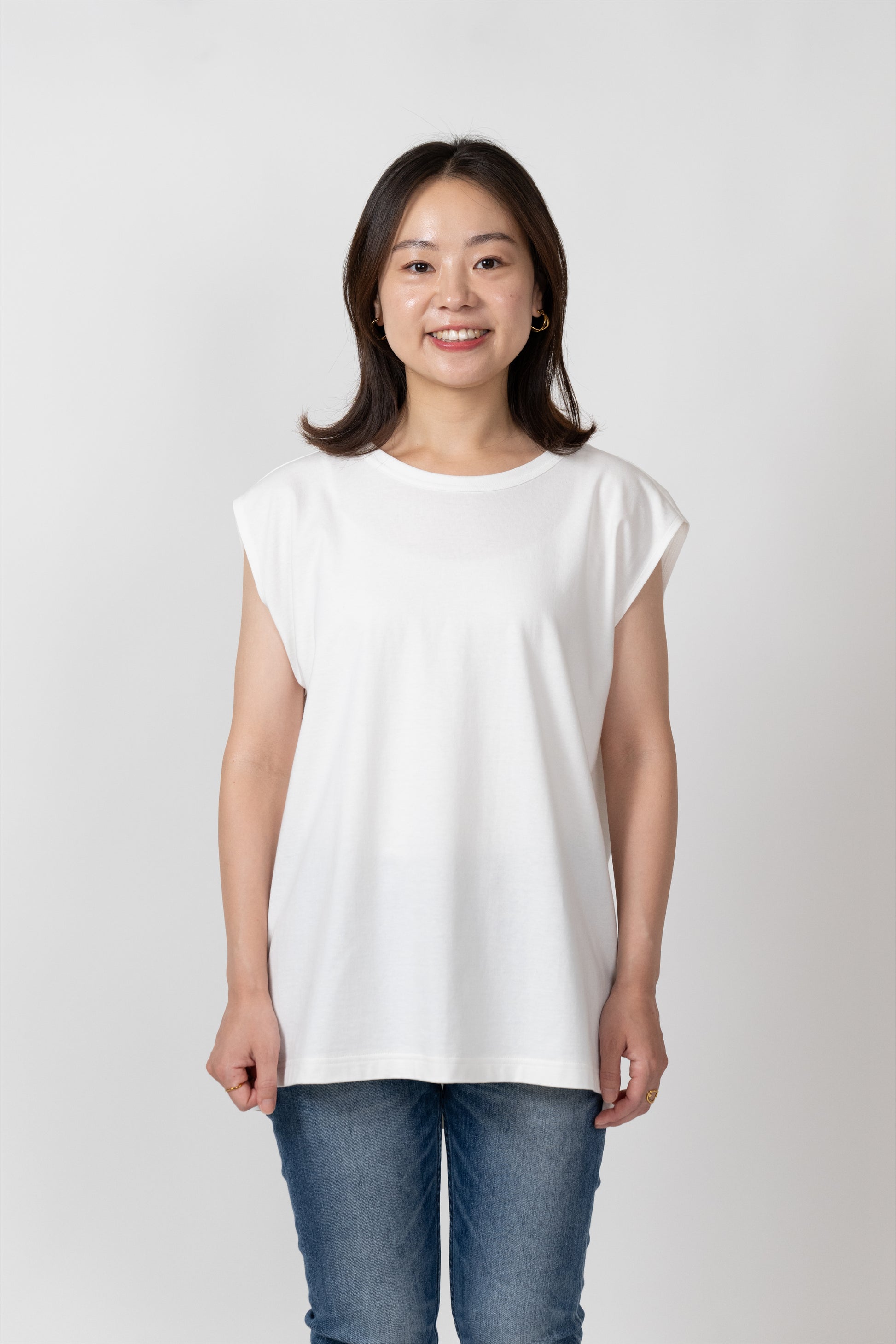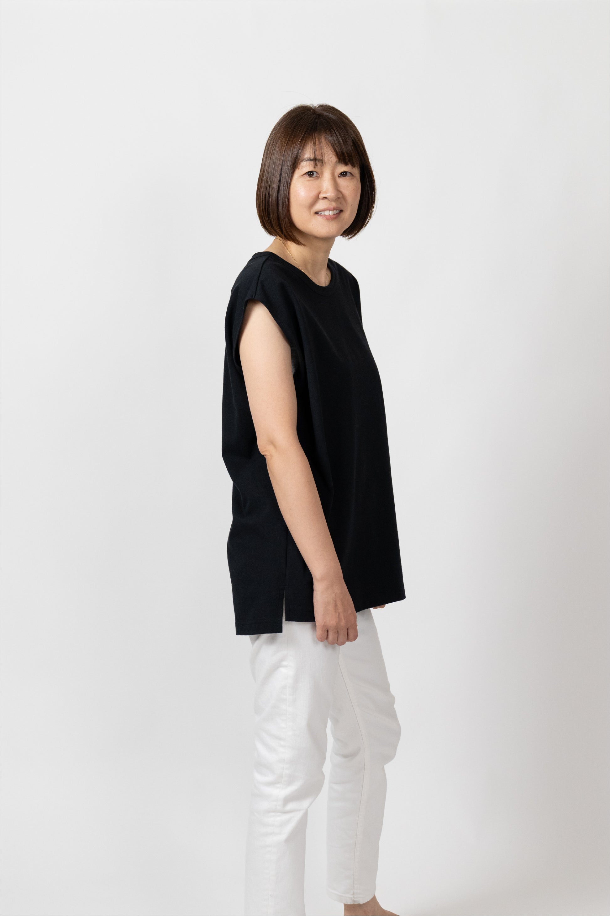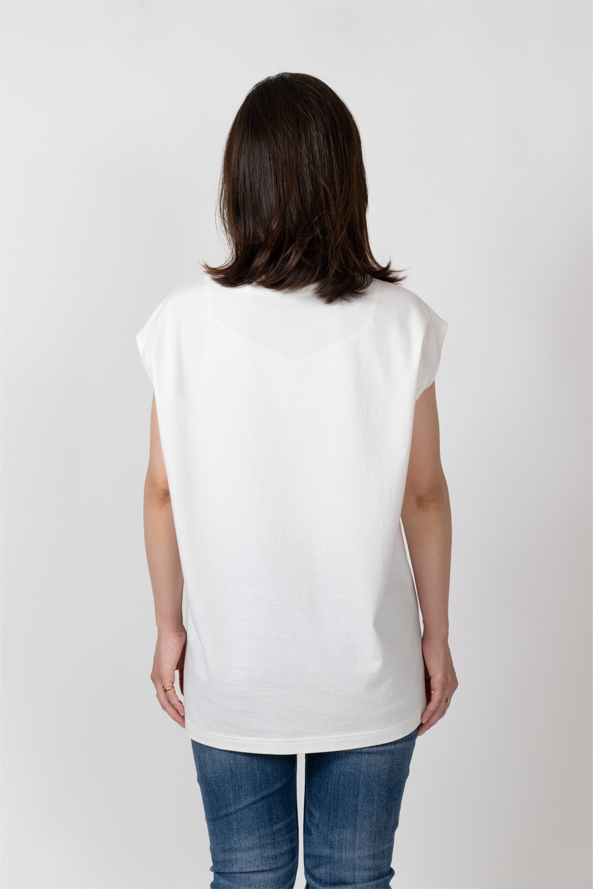 Sleeveless T-shirt with a relaxed fit. The silhouette is designed to fit a rounded shoulder posture having a lot of room around the shoulders, making it easy to move your shoulders without stress regardless of your body shape. The french sleeves cover the shoulders nicely and the neckline is not tight, so it feels comfortable in the summer. A highly versatile piece that can also be worn as an inner layer for shirts and jackets.