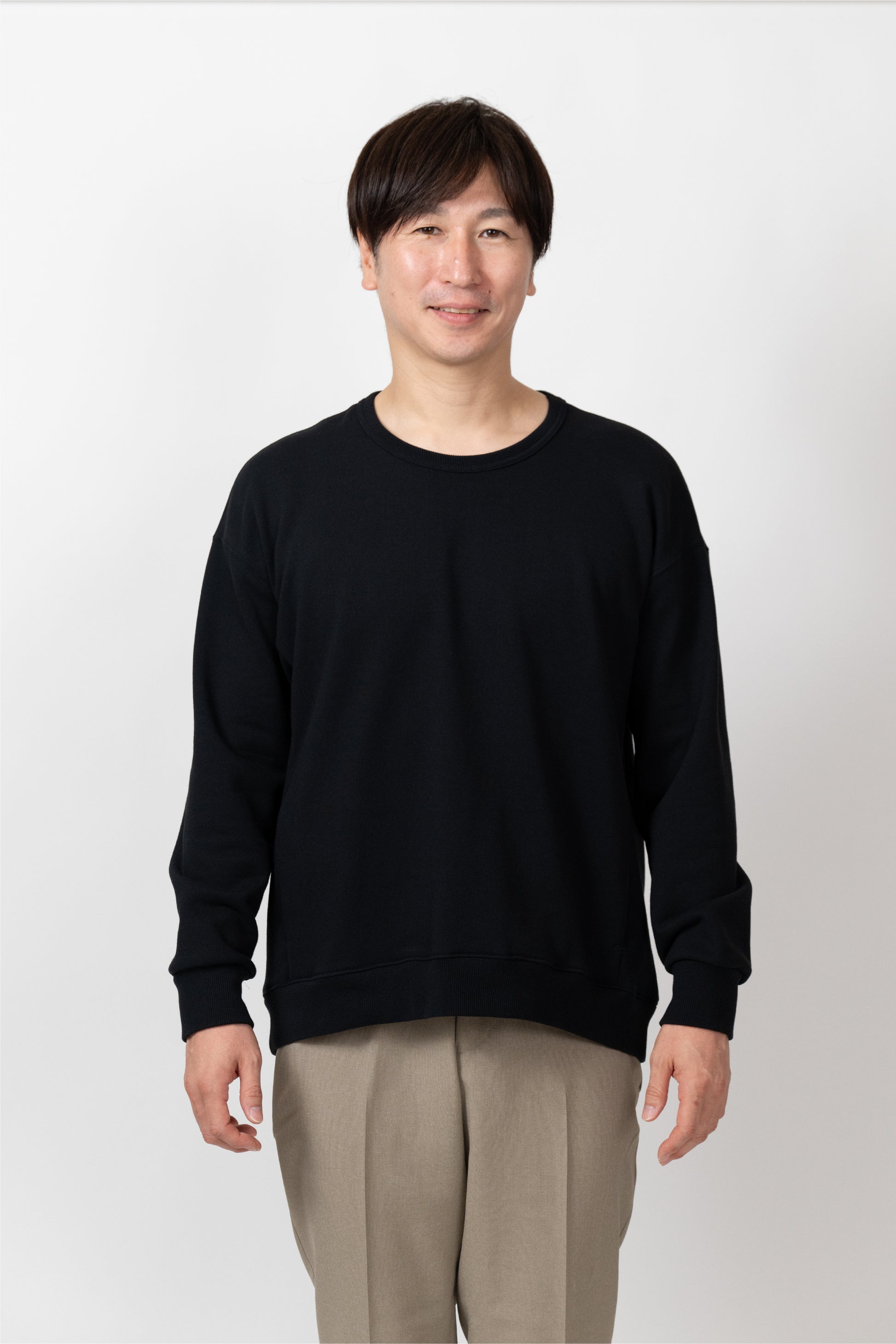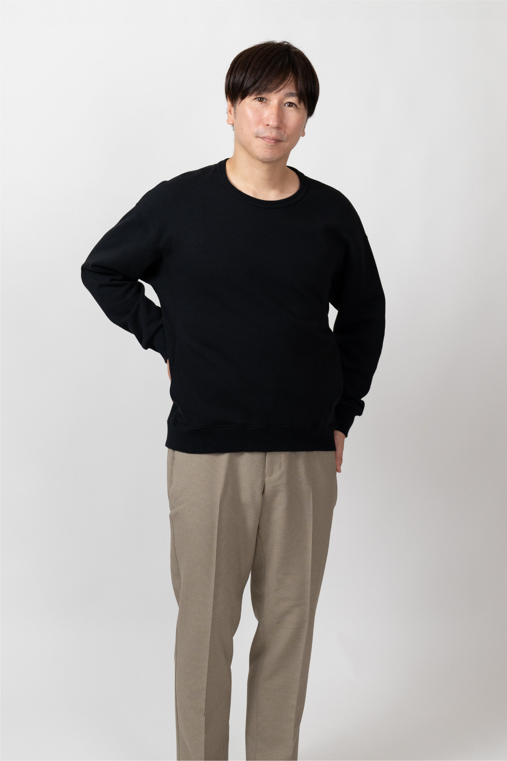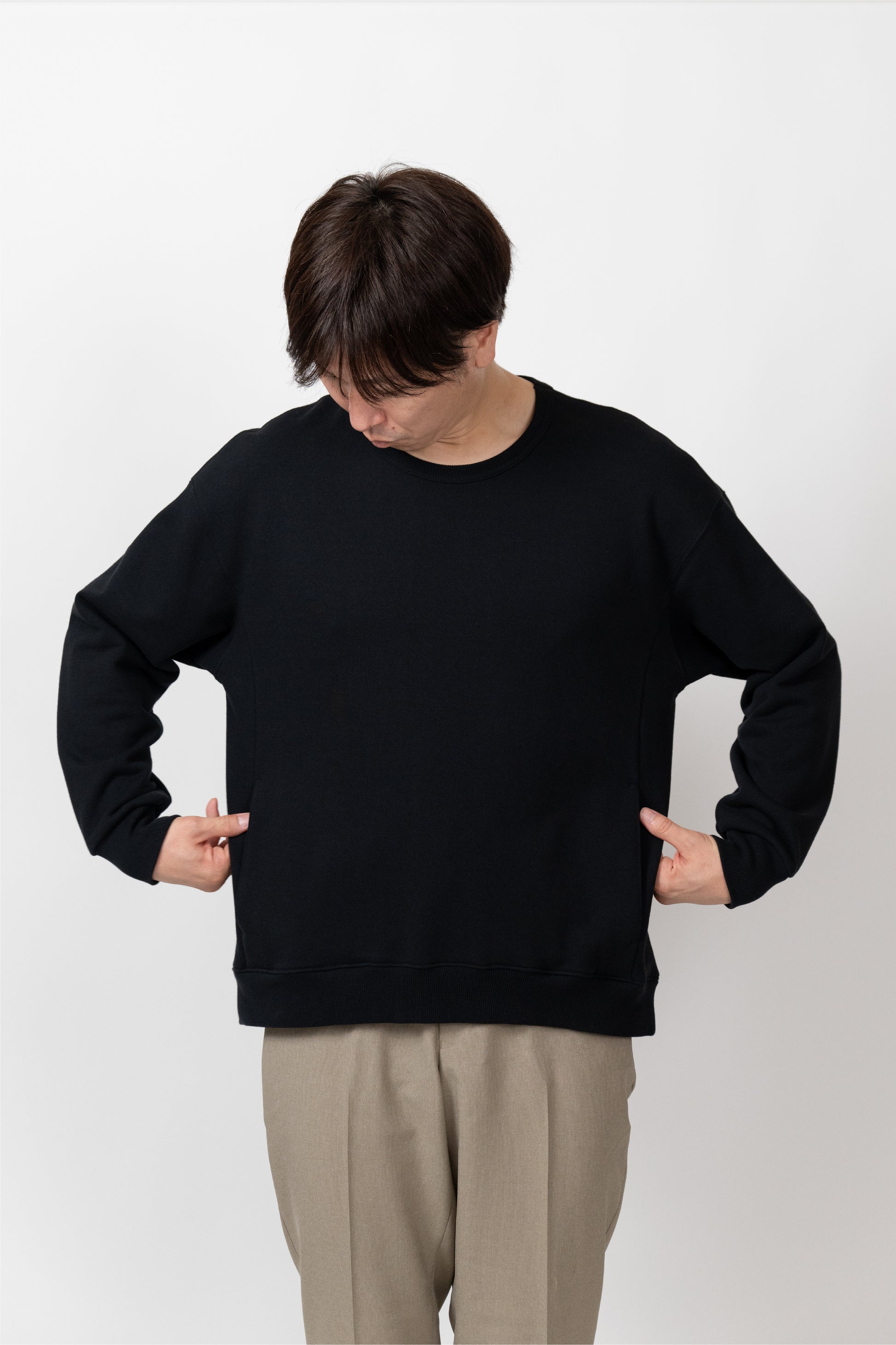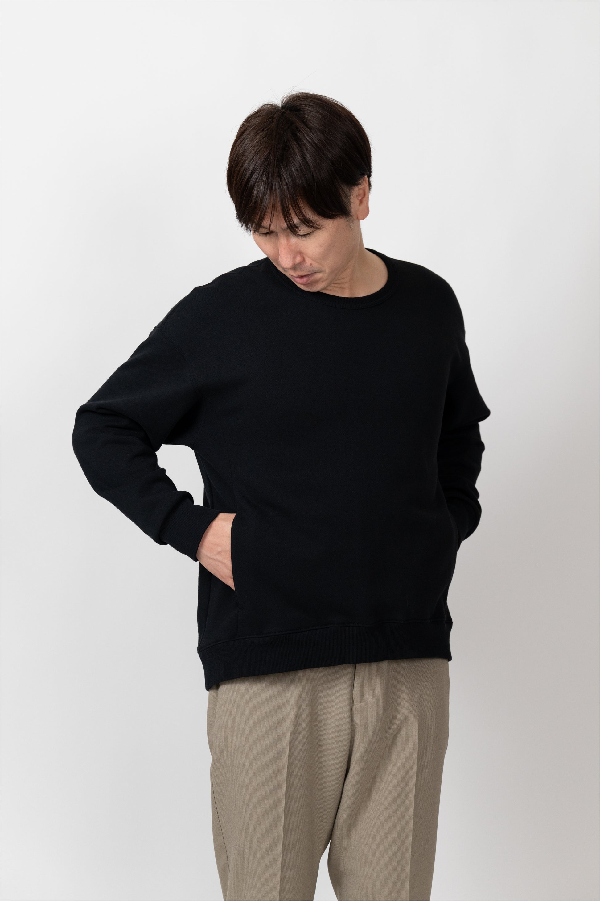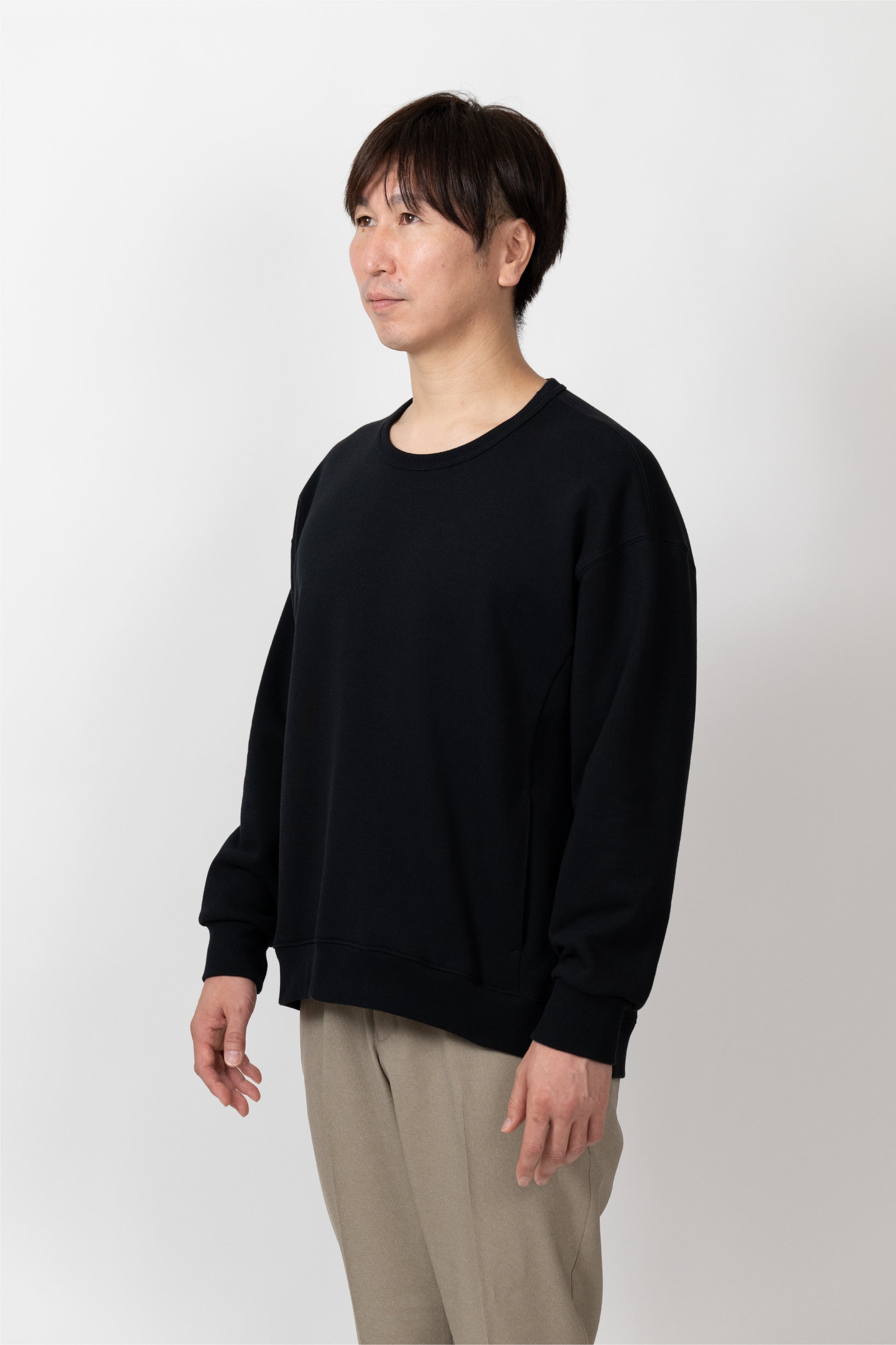 A basic item that can be worn with a loose fit. The silhouette is designed to fit a rounded shoulder posture having a lot of room around the shoulders, making it easy to move your shoulders without stress regardless of your body shape. The neckline is not tight. Casual but also sharp, and the pockets on both sides are convenient.