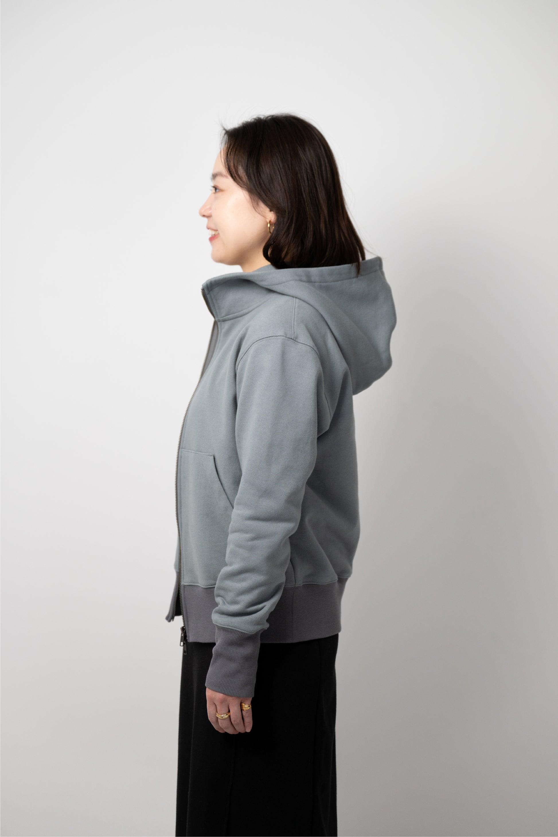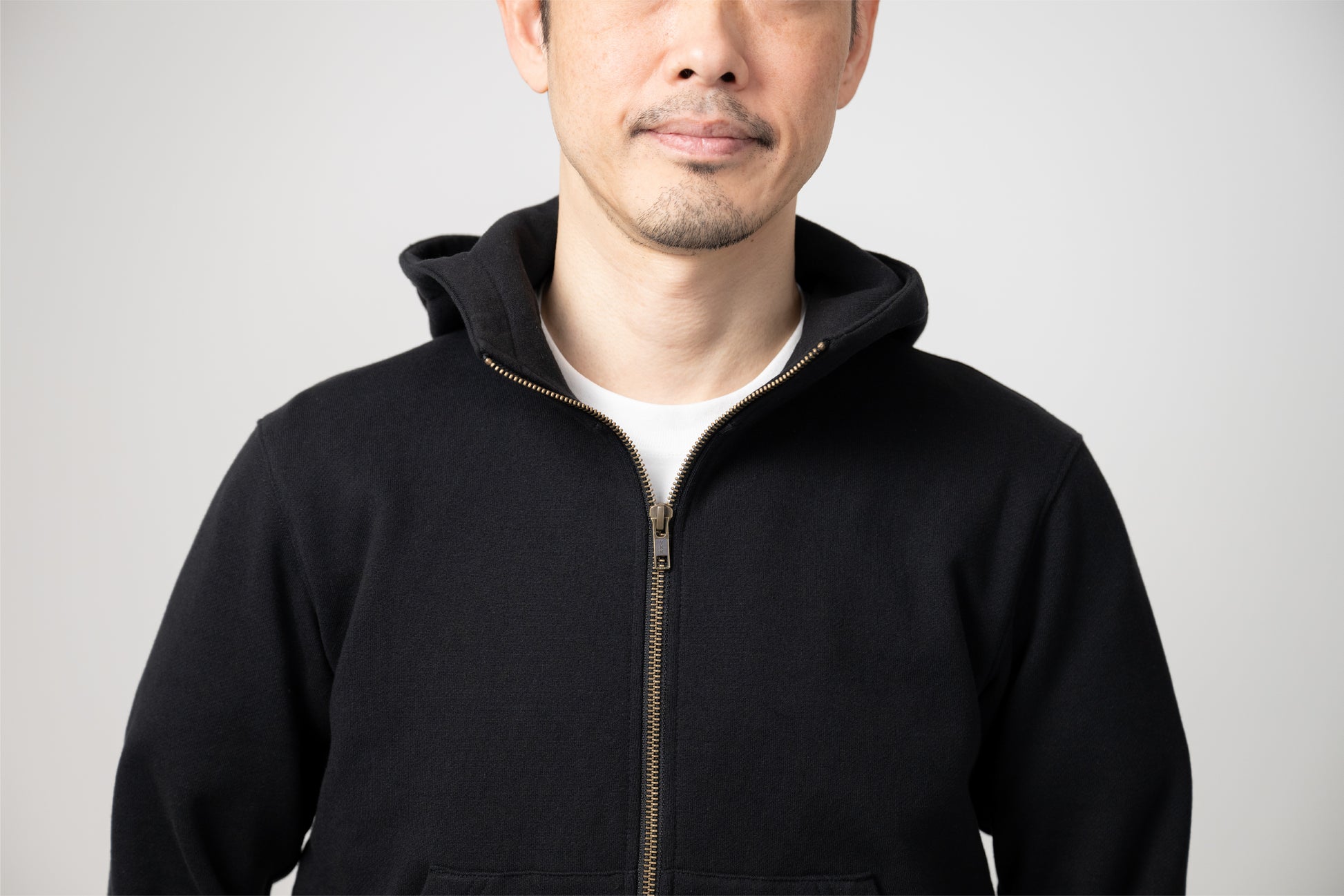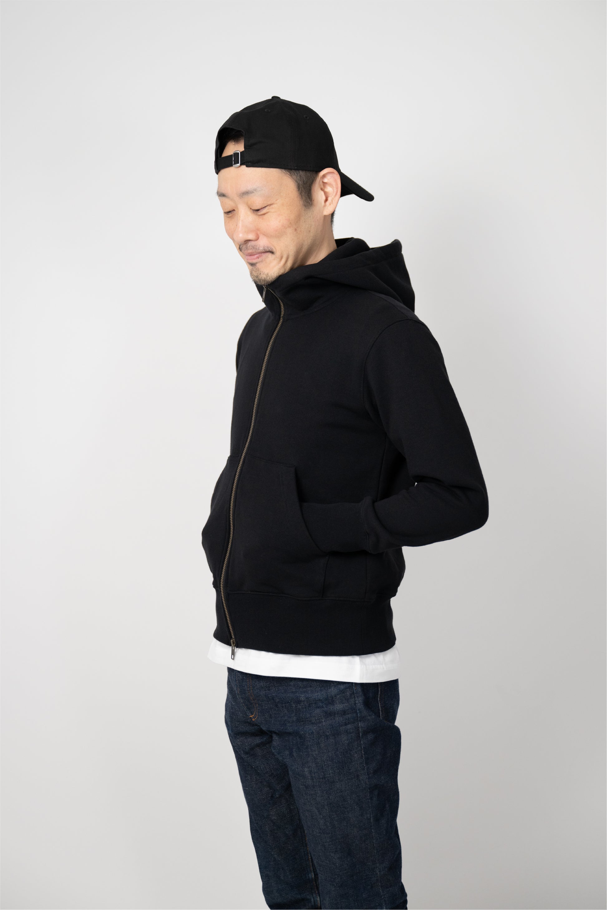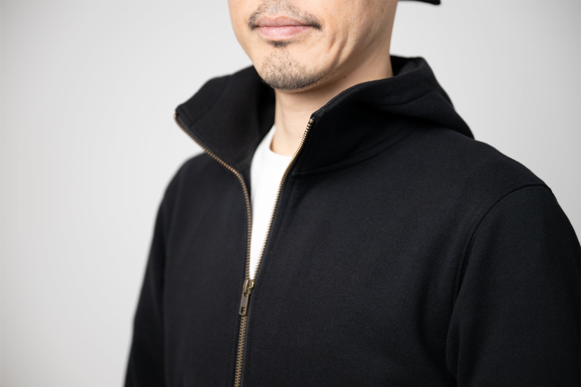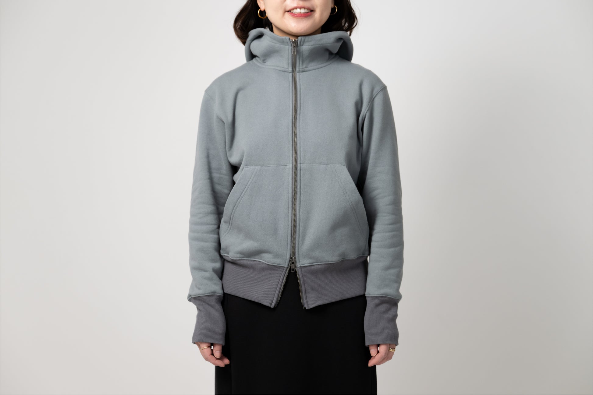 フィット感のあるフルジップパーカー。フードは生地2枚重ねで、立体感を出す形が特徴のこだわりシルエット。インナーとしてもアウターとしても通年使え、ジェンダーや年齢関係なく長く着続けられる一枚。ジッパーはブラックにはアンティークゴールド、グレーにはアンティークシルバーのエレメントを使用。ダブルジップで利便性もあり着こなしも様々。