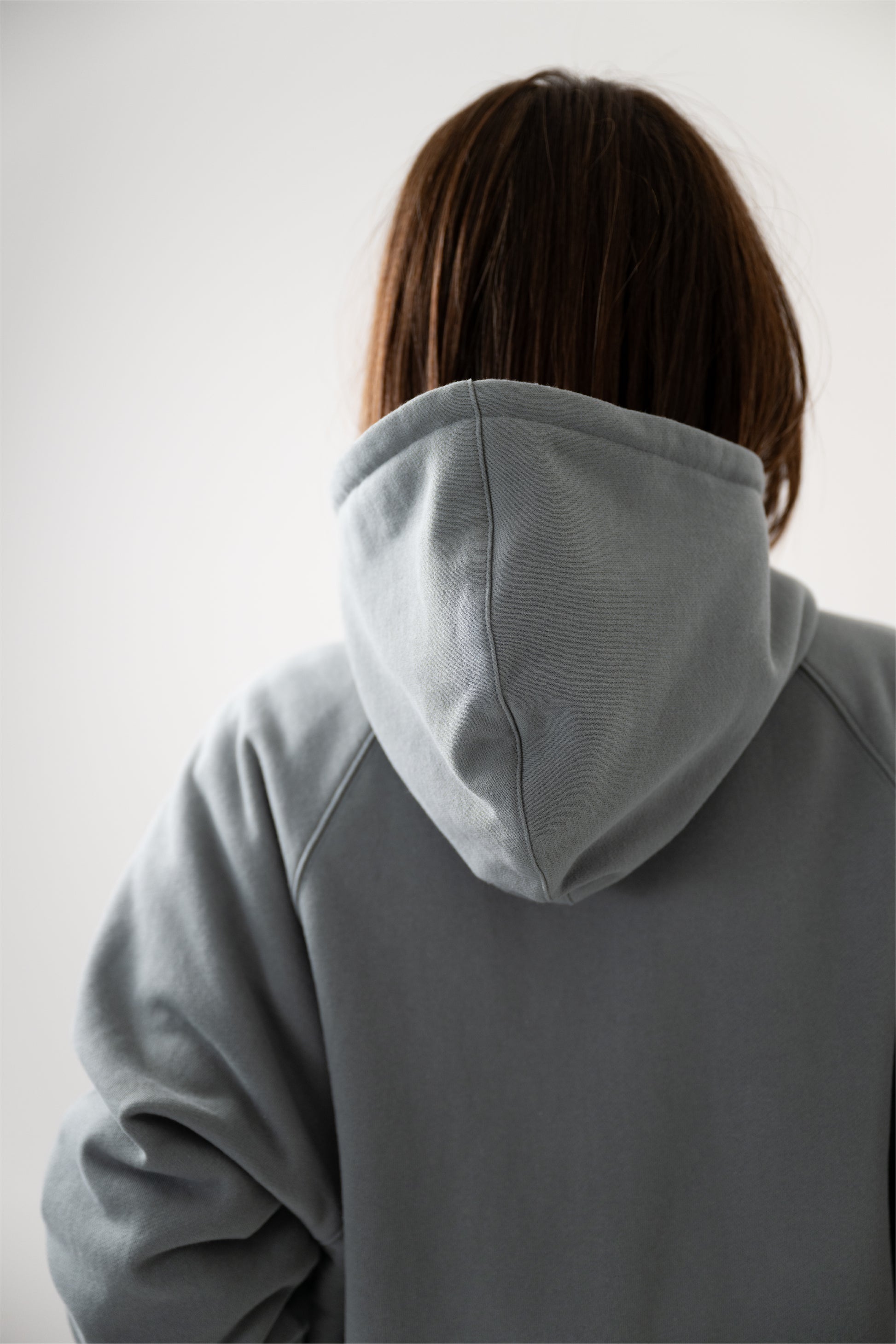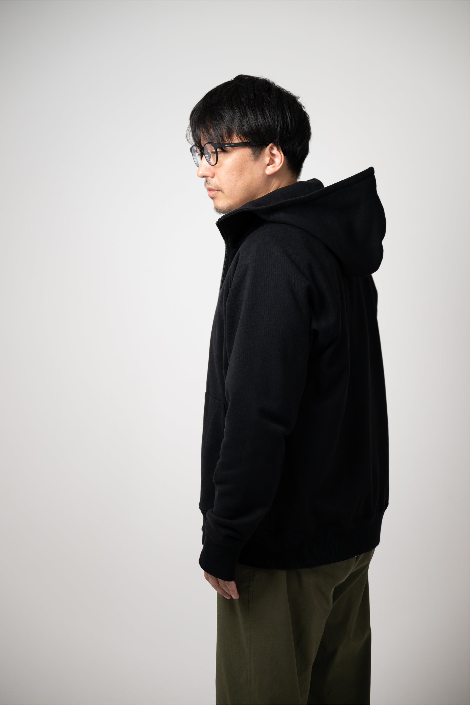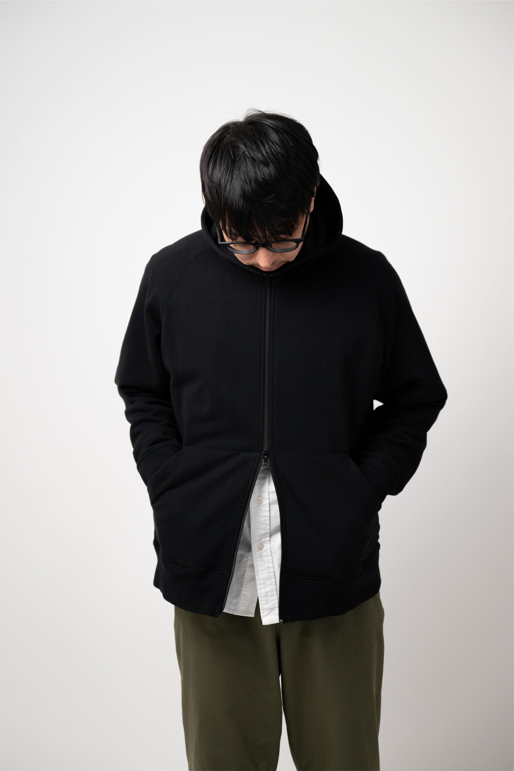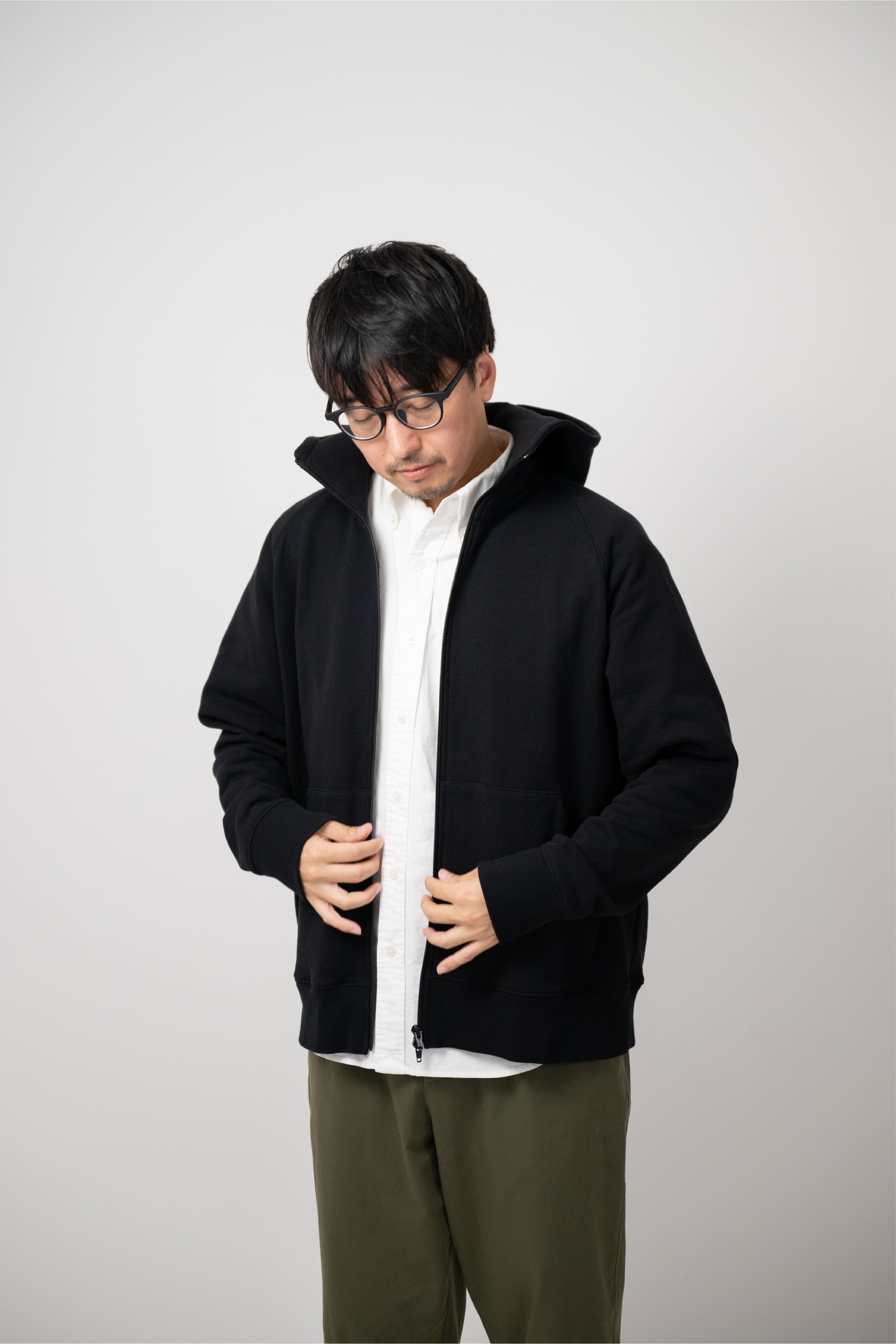 クラッシックなラグランスリーブのフルジップパーカー。フードは生地2枚重ねの台衿付きで、立ち上がりがしっかりした特徴のこだわりシルエット。カジュアルながらもどことなくメリハリある印象で、ジェンダーや年齢関係なく長く着続けられる一枚。ダブルジップファスナーで利便性もあり着こなしも様々。
