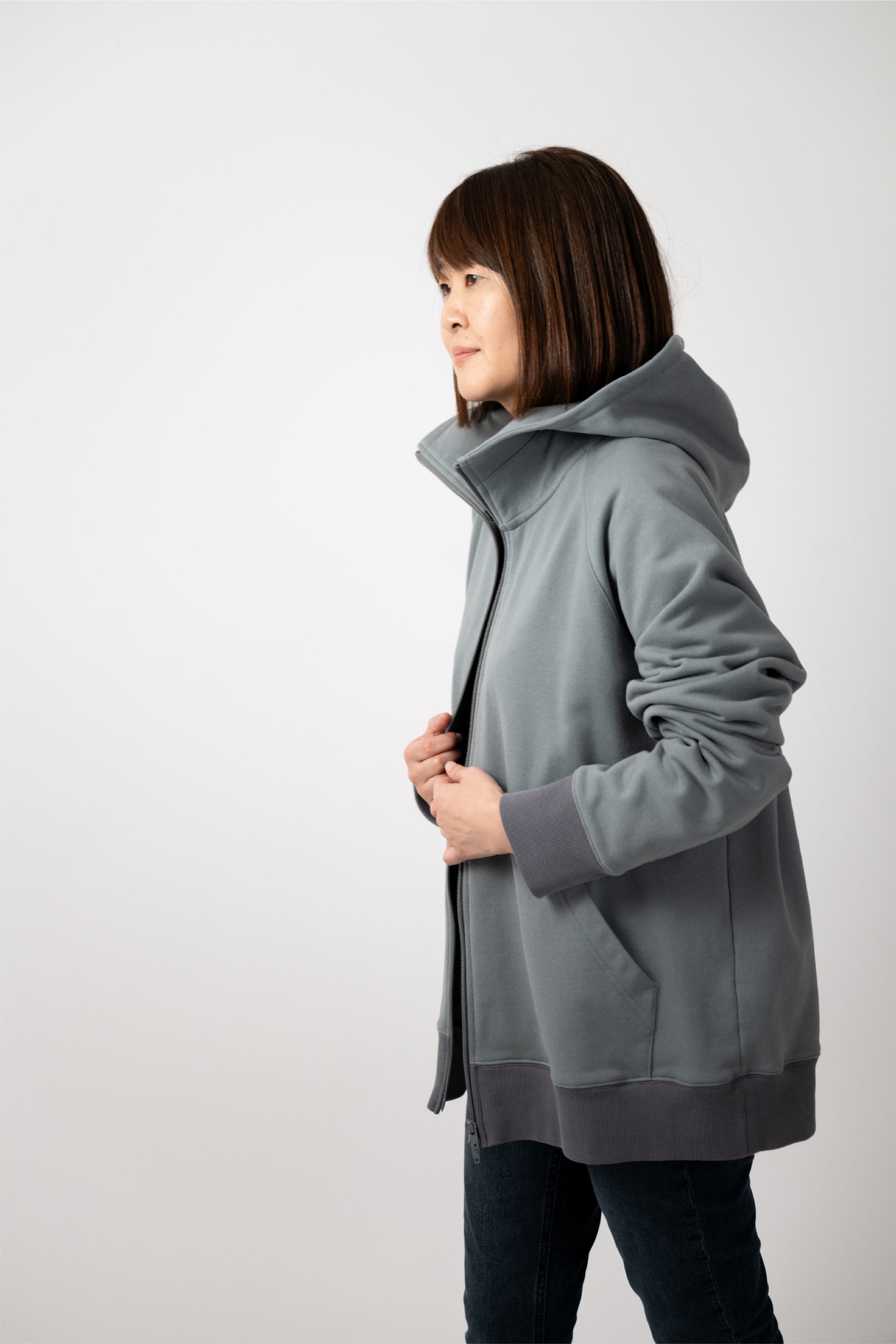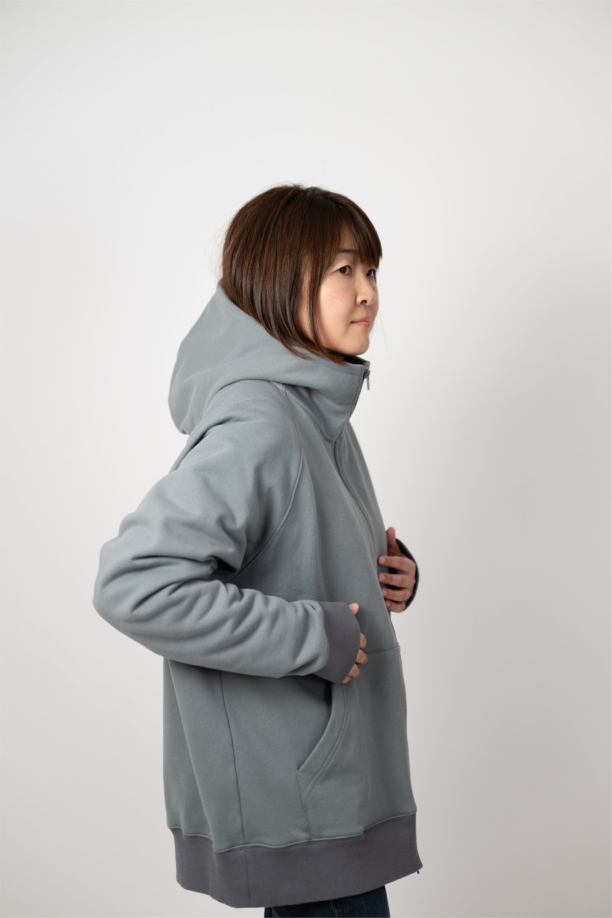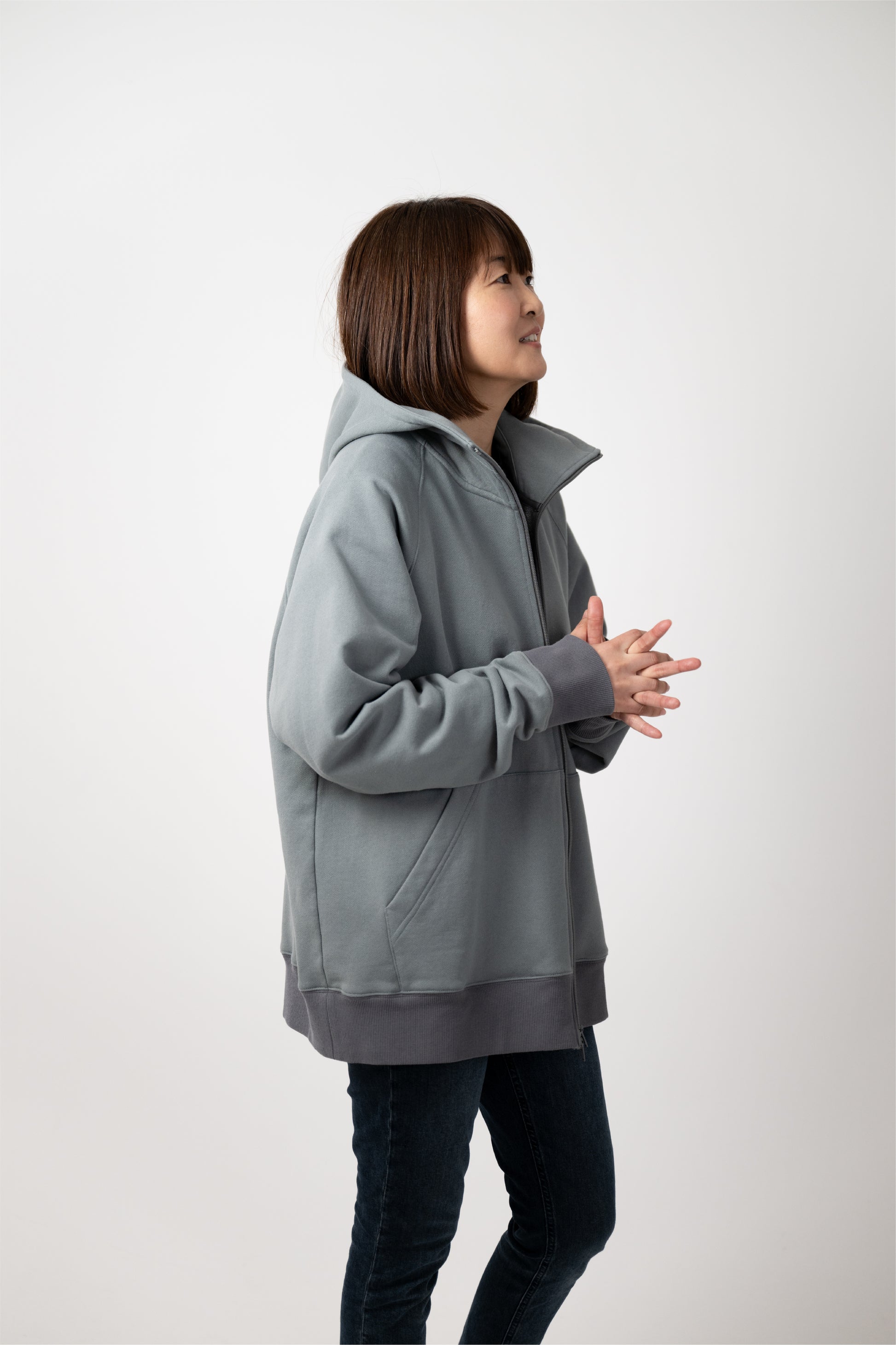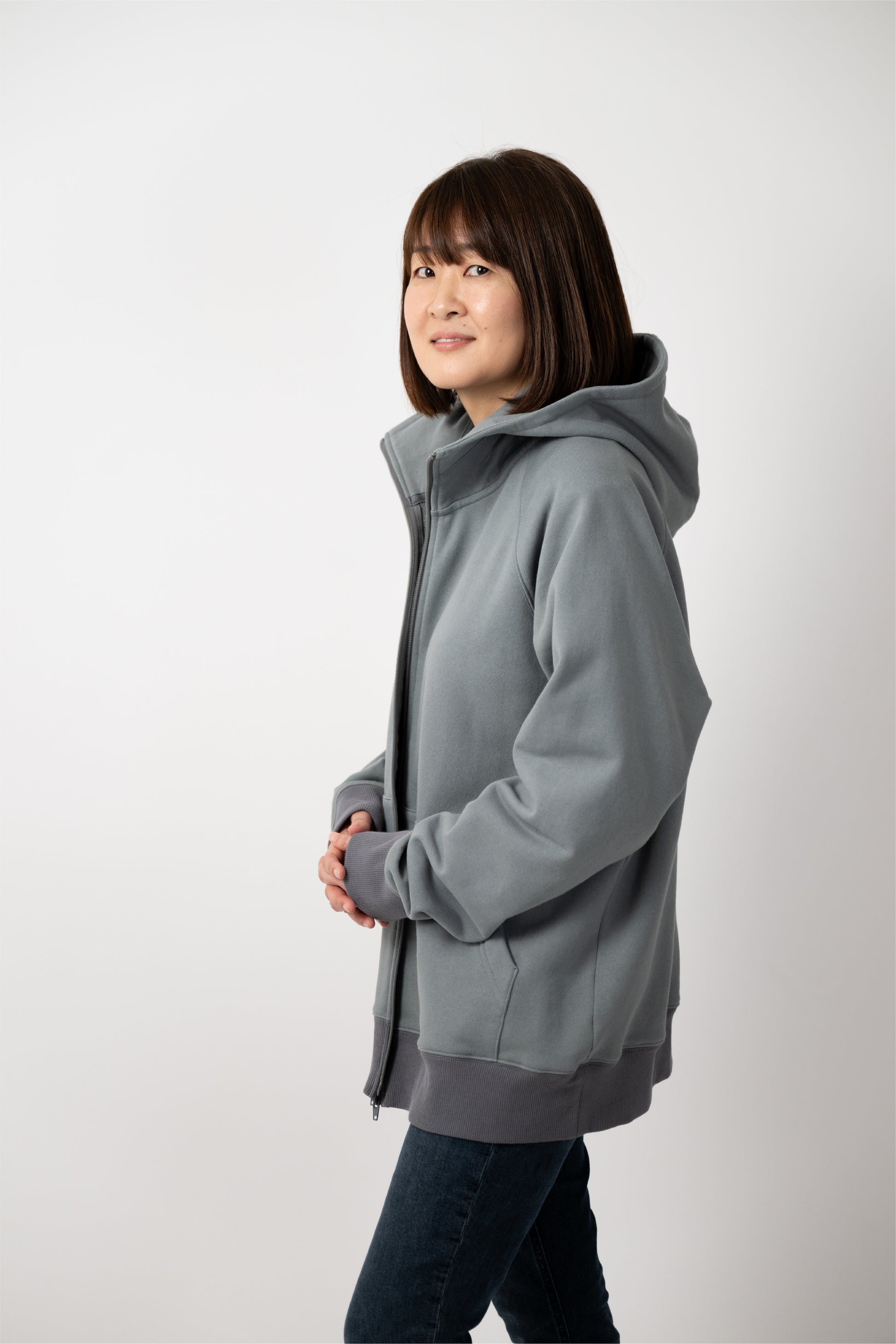 クラッシックなラグランスリーブのフルジップパーカー。フードは生地2枚重ねの台衿付きで、立ち上がりがしっかりした特徴のこだわりシルエット。カジュアルながらもどことなくメリハリある印象で、ジェンダーや年齢関係なく長く着続けられる一枚。ダブルジップファスナーで利便性もあり着こなしも様々。